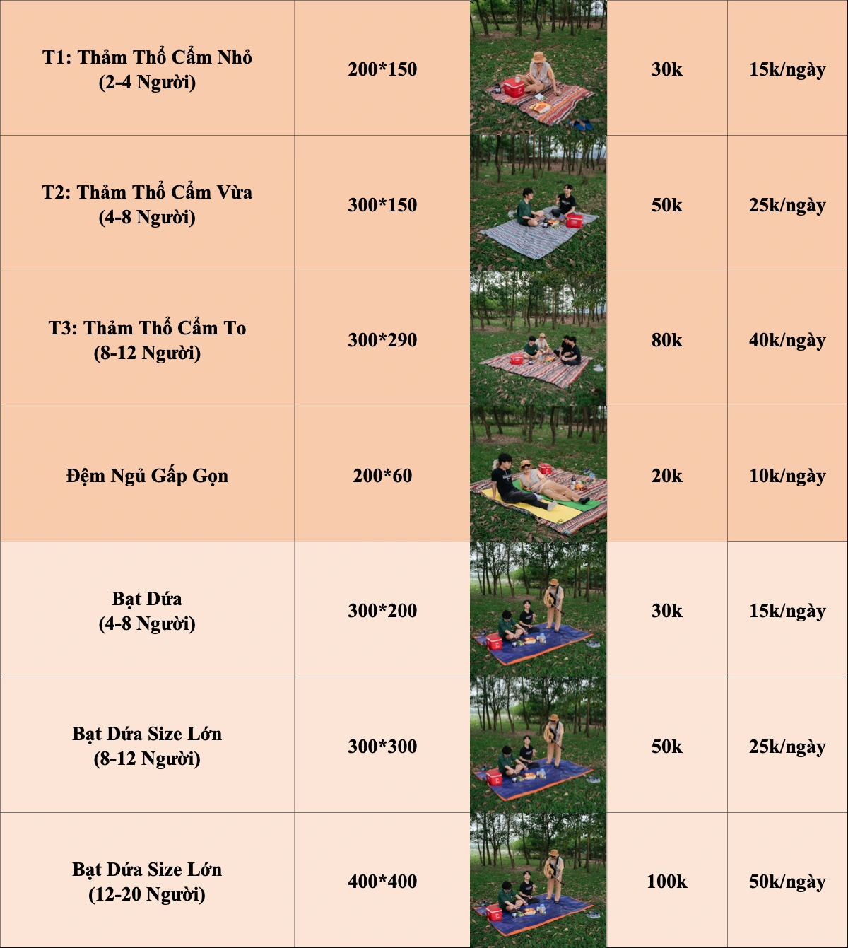 ☘️ Thuê phụ kiện dã ngoại khác như: bàn ghế dã ngoại, thùng đá, bạt trải, thảm ngồi ăn uống, đồ decor, ...